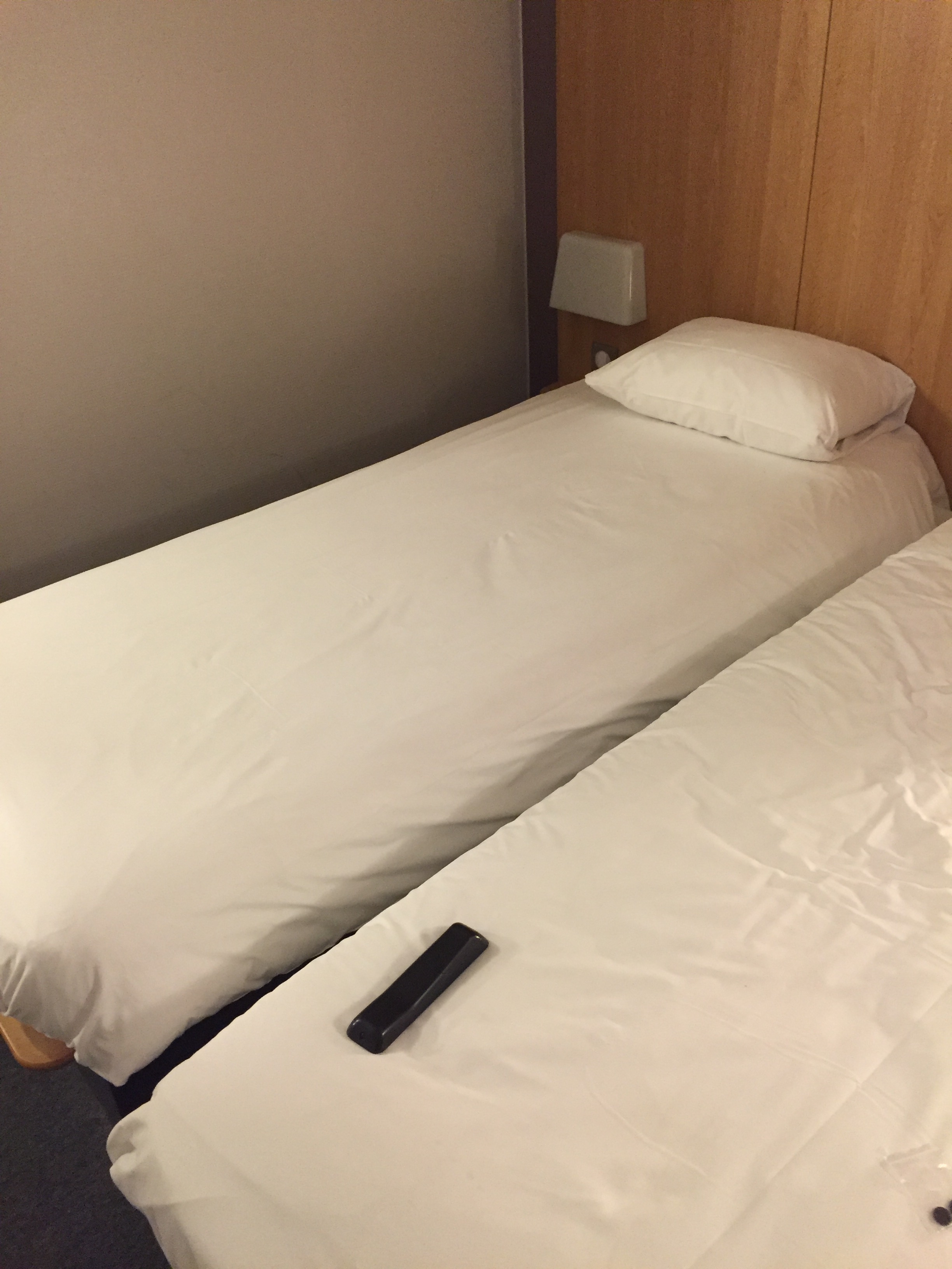 ちなみにこちらがホテルのベッド。1人で止まったのに2人用とはありがたい。ヨーロッパのホテルのベッドはたいてい寝返りうつと落ちるぐらいに狭いので、2人用の部屋だと1.5人分ぐらいの感じのベッドの広さでゆったり眠れます。